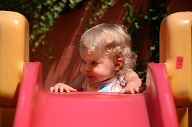 Mom: She's very brave about climbing up to the top, but not about coming down. It's cause she falls on her butt and once she bumped her head... not even hard! So dramatic ;o) About the sandals, the blue ones fit her great and are so cute, but the back slips off a lot and she gets really cranky about it. So we usually go with the tan ones cause they're more stable. And the neutral color helps, too... especially when she's wearing a bright pink dress ;o)
